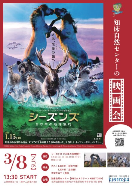 知床自然センターMEGAスクリーン「KINETOKO」にて、映画上映会を開催します。 上映作品は『シーズンズ 2万年の地球旅行』。 氷河期から現代まで、2万年にわたる地球の季節の移ろいと、自然の中で生きる動物たちの姿を、美しい映像で描いたドキュメンタリー作品です。 ■ 日時: 20…