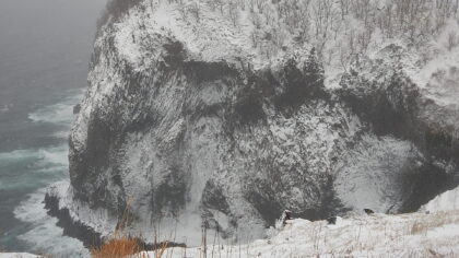 展望台からは吹き付ける雪でかっこいい白黒模様になった崖が。